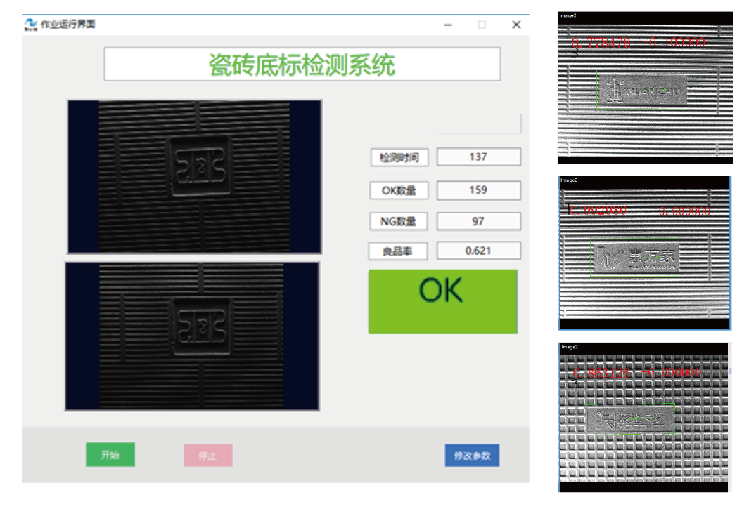 應(yīng)對勞動力成本攀升和自動化升級的需要,針對陶瓷行業(yè)多種品牌瓷磚混燒下磚時有其他品牌瓷磚混入的情況,開發(fā)了窯尾陶瓷底標(biāo)識別系統(tǒng),識別非目標(biāo)品牌并進(jìn)行剔除,同時能夠支持目標(biāo)識別品牌的快速切換,便捷的的作業(yè)設(shè)置,簡單的參數(shù)調(diào)節(jié),應(yīng)用于TOP陶瓷生產(chǎn)企業(yè)。